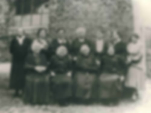 Die Frauen der jüdischen Gemeinde in Vreden 1935 vor der Synagoge: (sitzend von links nach rechts) Margarethe Heimann geb. Nordheim, Bertha Rosenthal geb. Cohen, Jeanette Cohen und Vrouwgje van Gelder geb. van Zuiden, (stehend von links nach rechts) Klara Herz geb. Straus, Frau Hilda Auerbach geb. Fromm, Frieda Mogendorff geb. Katz, Sophie Herz, Selma Wolff geb. Gumpert, Ida Mogendorff geb. Katz und Henriette Rosenthal geb. van Gelder